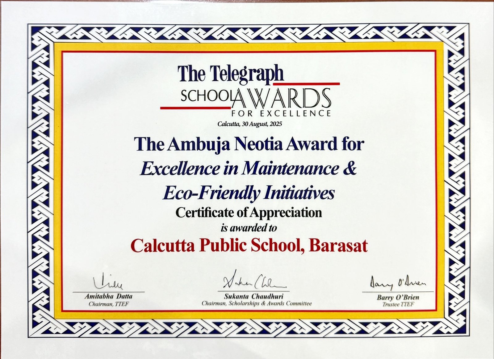 Telegraph School Awards 2025 Certificate of Appreciation for Excellence in Maintenance & Eco Friendly Initiatives