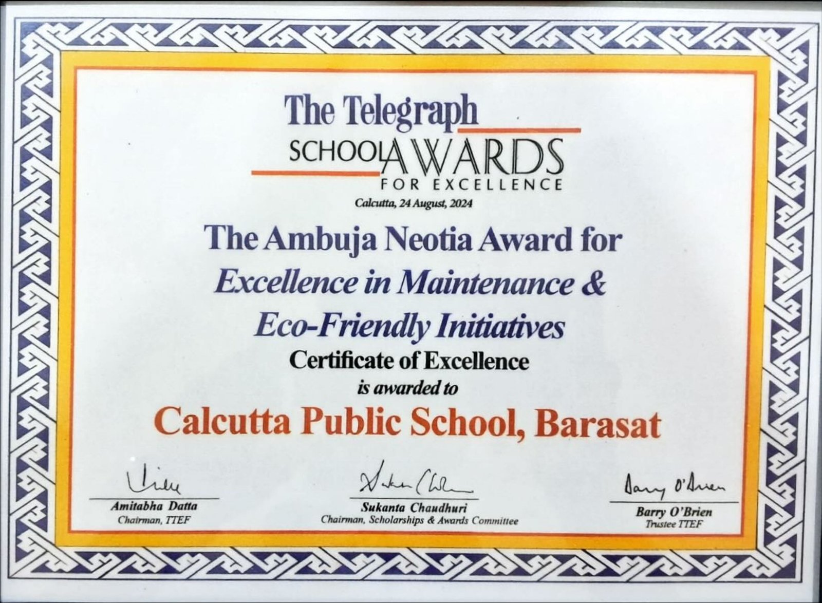 The Telegraph School Awards 2024 Certificate of Excellence for Excellence in Maintenance & Eco-Friendly Initiatives